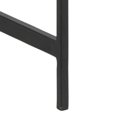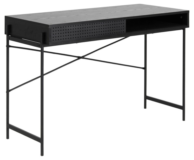 Czarne biurko Angus zostało stworzone dla ludzi lubiących dobry design zaklęty w minimalistycznym meblu. Kompaktowe biurko o głębokości 50 cm to idealny mebel do małego biura lub pokoju nastolatka. Blat biurka został zrobiony z płyty MDF w czarnej okleinie imitującej słoje drzewa jesionu. Pod blatem ukryta została półka, którą osłania ażurowy, przesuwny front wykonany również z płyty MDF. Lekka metalowa konstrukcja optycznie zmniejsza biurko, co sprawia