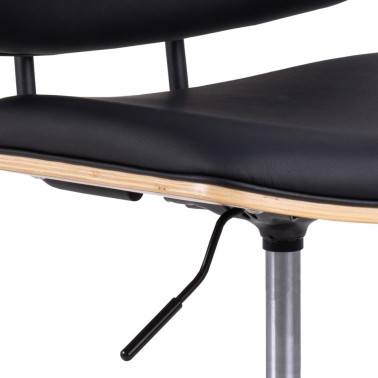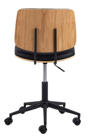 Nadaj swojemu kącikowi do pracy nową iskrę dzięki temu wyrazistemu fotelowi do biurka z regulacją wysokości. Połączone dwiema czarnymi stalowymi rurkami, siedzisko i oparcie posiadają giętą okleinę z lakierowanego dębu, która jest wykończona warstwą pianki i czarną tkaniną ze sztucznej skóry dla zwiększenia komfortu. Pięcioramienna podstawa posiada funkcję obrotową i kółka z miękkim hamulcem dla dodatkowej funkcjonalności. Siedzisko i oparcie wykonane z giętego, lakierowanego forniru dębowego, pianki i czarnej sztucznej skóry. Podnośnik gazowy umożliwia regulację wysokości siedziska w zakresie 46,5-58 cm. 5-gwiazdkowa podstawa z kółkami z hamulcem i funkcją obrotu. Miękkie kółka z hamulcem zapobiegają przesuwaniu się krzesła, gdy nie jest obciążone Wymiary kartonu: 35x60x58cm