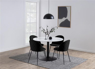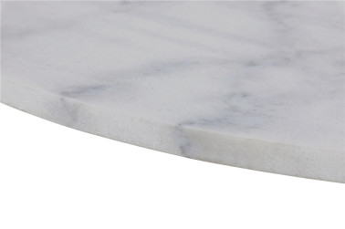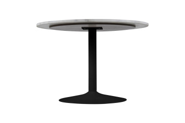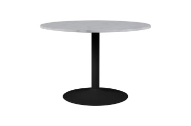 Stół okrągły z marmurowym blatem wykonanym z białego marmuru Guangxi połączony został z metalową matową podstawa w kolorze czarnym. Niezwykłe połączenie sprawia