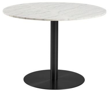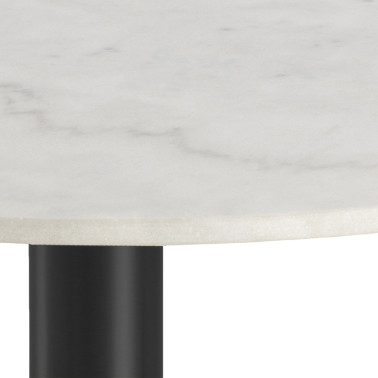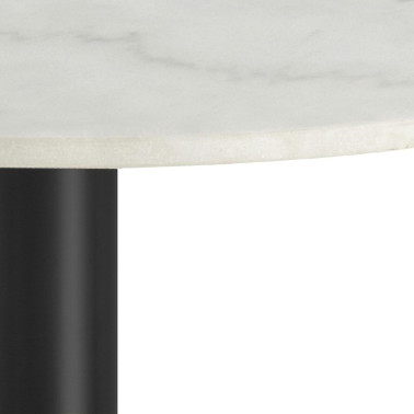 Stół okrągły z blatem z polerowanego białego marmuru Guangxi połączony został z malowaną proszkowo na czarno podstawą. Podstawa stołu to jedna noga na szerokiej podstawie. Niezwykłe połączenie sprawia