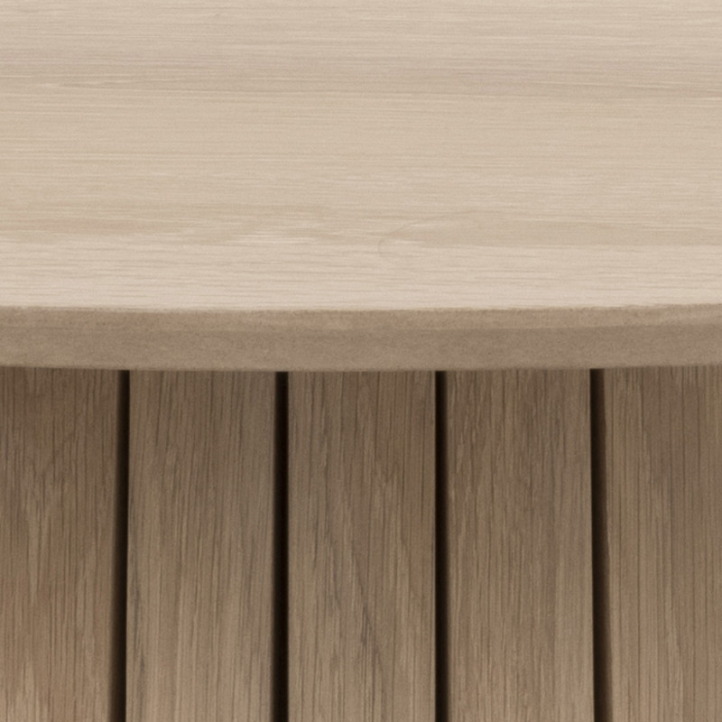 Stół Christo to wyjątkowy projekt o nietypowym designie. Posiada okrągł blat o średnicy 120cm oraz podstawę w kształcie walca złożonego z pionowych listew. Stół w całości wykonany jest z bielonego forniru dębowego. Jego minimalistyczna forma i neutralna barwa sprawiają
